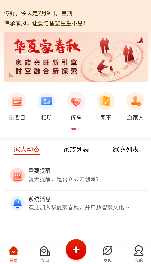 1、启动应用后,首页集合了家族重要日期提醒、共享相册、家事记录等核心功能入口,方便快速使用。