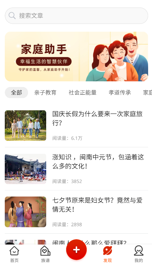 3、通过发现页可以浏览精选的家庭教育、传统文化类文章,也可直接搜索感兴趣的家庭话题内容。