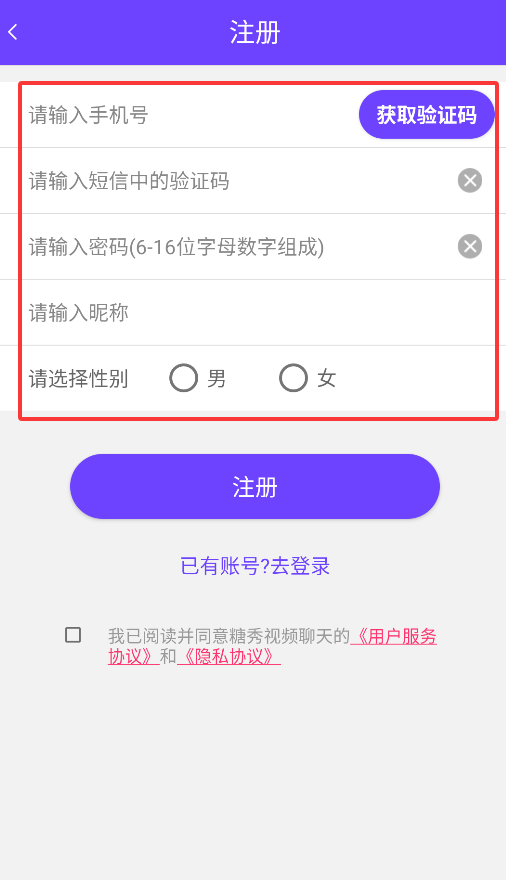 2、按要求填写有效手机号码,获取并输入6位短信验证码,设置8-20位密码并完善昵称、性别等基本信息。