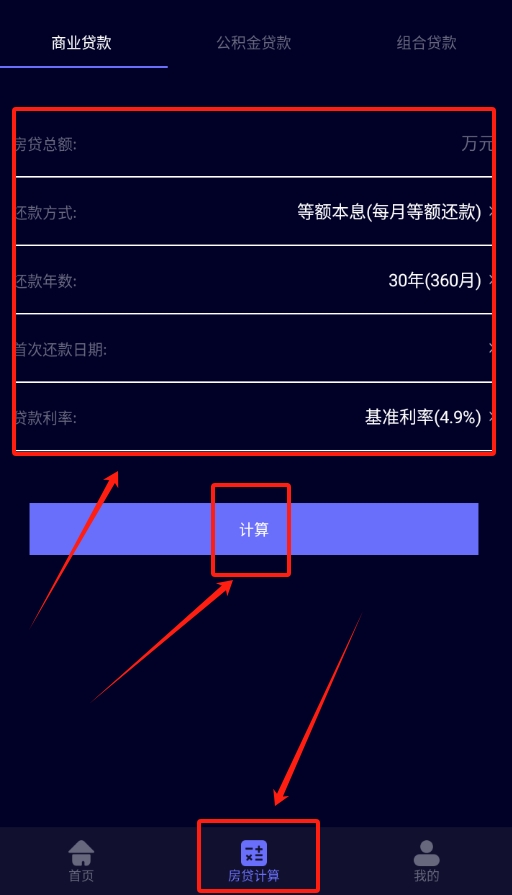 4、想计算房贷的话,找到房贷计算页面点进去,里面有相关的计算功能,按提示输入信息就能进行计算了。