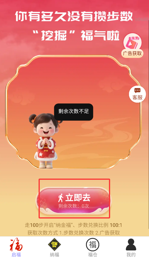 1、启动应用后,在"启福"页面点击"立即参与"按钮,完成100步行走即可激活纳金福功能。