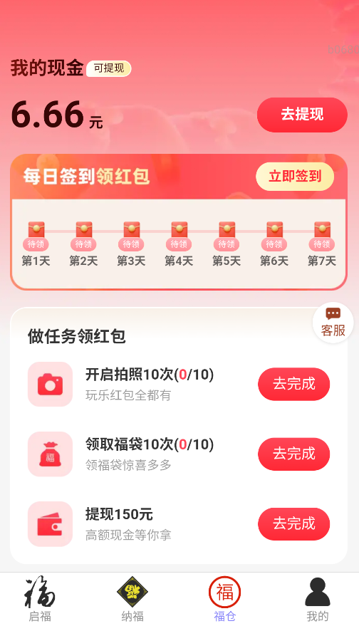 3、"福仓"页面提供每日签到奖励和任务奖励,完成指定任务可领取现金红包。