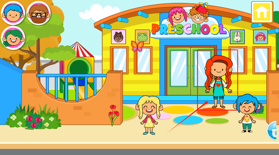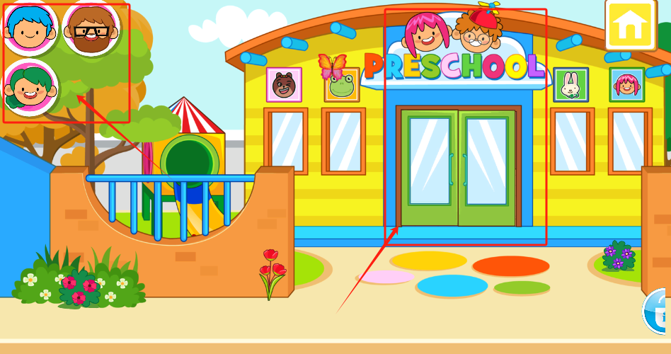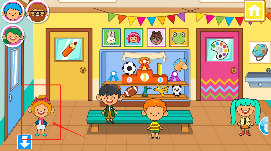 4、看扎双马尾的小女孩,旁边箭头提示互动,屋里奖杯柜前小朋友们在开心玩耍哟。
