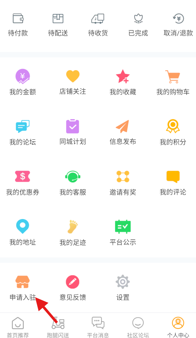 2、进入 “个人中心” 页面后,在页面最下方找到 “申请入驻” 选项并点击,跳转至入驻申请界面。