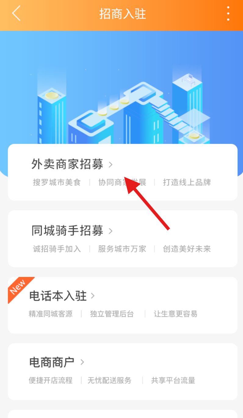 3、在入驻申请界面中,找到并选择第一个 “外卖商家招募” 选项,进入外卖商家入驻信息填写页面。