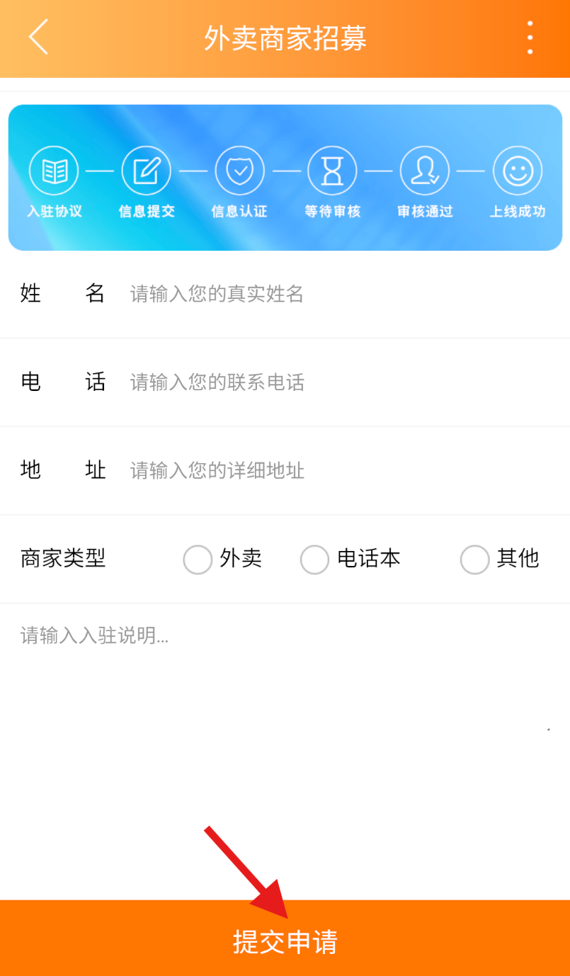 4、在该页面中,依次输入姓名、电话、地址、商家类型和入驻说明,确认信息无误后点击提交申请即可。