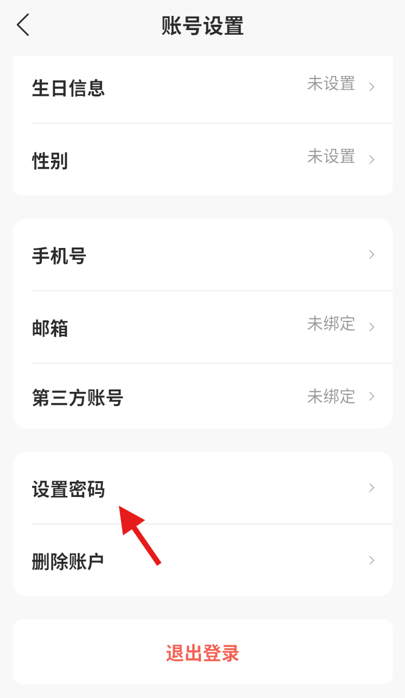 4、在账号设置页面中,向下滑动屏幕,找到 “设置密码” 这一功能选项,点击进入密码设置界面。