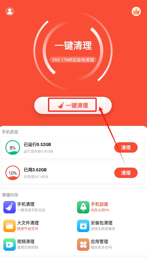 4、登录成功之后,在软件首页找到一键清理的选项,直接点击这个选项,软件就会自动清理手机里的垃圾了。