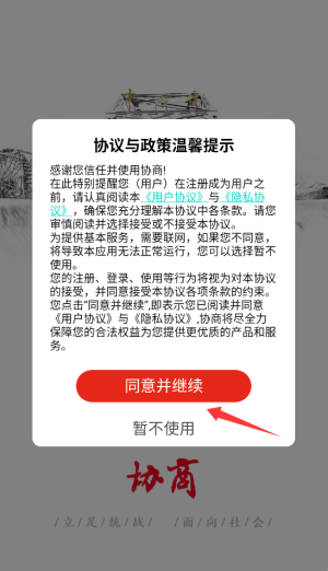1、启动协商APP后,首次使用需阅读并同意用户协议和隐私政策,点击确认进入主界面。
