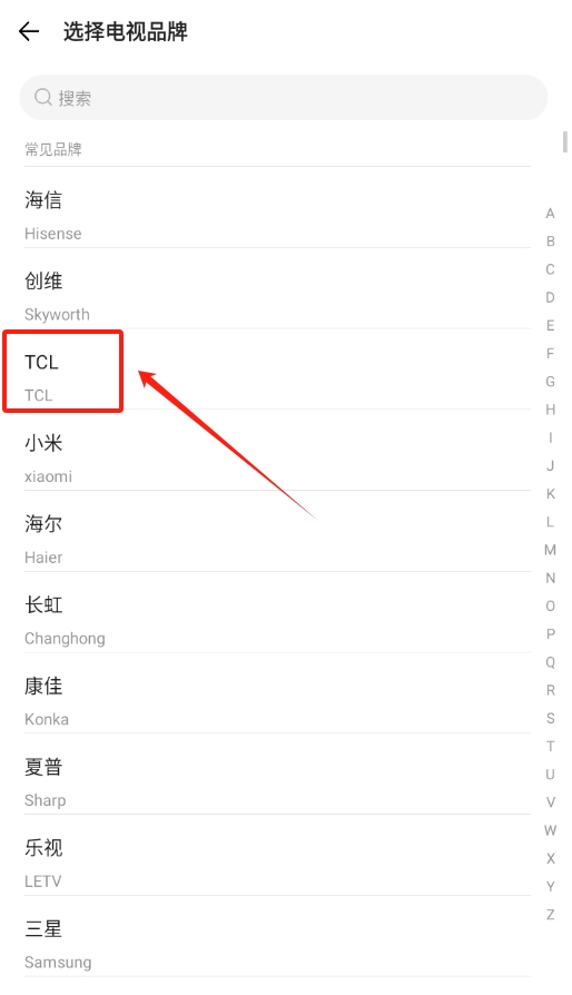 3、接着会出现多个电视品牌列表,在里面找到自己家电视对应的品牌并点击,进行下一步操作。