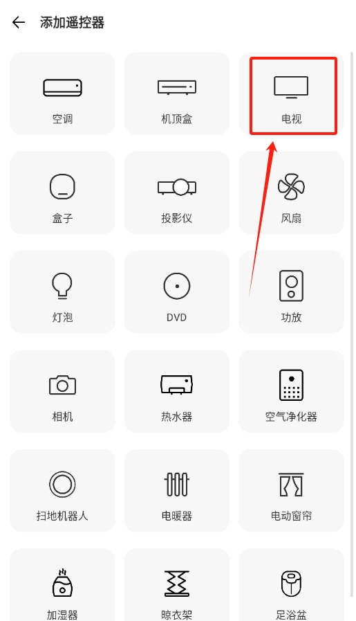 2、进入添加页面后,会看到各种设备类型,从中找到电视选项并点击,准备添加电视遥控器。