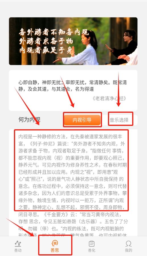 2、进入善思页面,里面有不少内视引导的文章,读这些文章能帮助平静心情,带来不一样的思考和感悟。