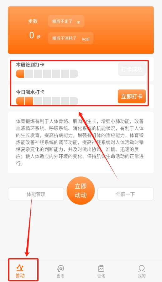1、打开软件后,找到善动页面点进去,在这里能进行喝水打卡和每日签到,记录自己的健康生活习惯很方便。