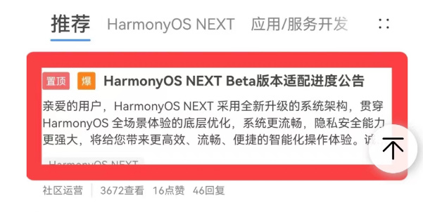 2、打开论坛,找到推荐顶部的【HarmonyOS NEXT beta版本适配进度公告】。