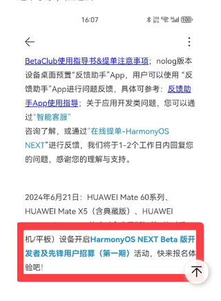 纯血鸿蒙next支持的机型:开发者和先锋用户Beta