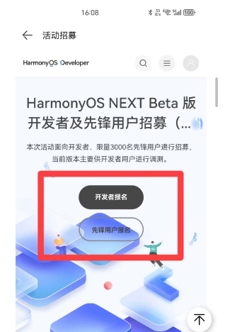 4、进入开发者及先锋用户招募频道,选择自己的报名方式。