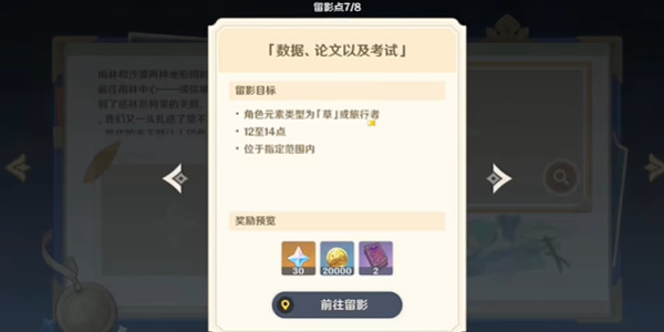 原神5.0版本中的提瓦特忆画数据论文以及考试的拍照位置在哪呢?很多的小伙伴对于这个还是比较好奇的,毕竟这个位置每日都是不一样的,很多的小伙伴对于这个拍照的地方都是比较难找到的,对于这个不清楚拍照地方的小伙伴可以和小编一起来看看详细的点位吧!