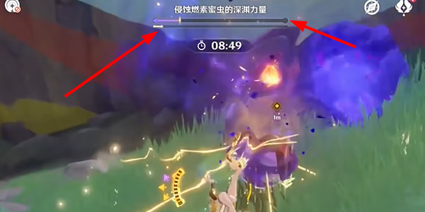 6、大家需要注意这个下面的这个白条是护盾,玩家需要先吧护盾打爆了,才能打到上面的这个深渊力量,然后这个深渊力量全部打空之后才能抓到虫子。