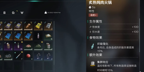 5、这个食谱的效果是火属性伤害提高,并且这个在这个还有一个额外的效果,就是制造类设施制造时间缩短15%。