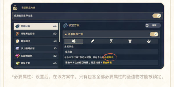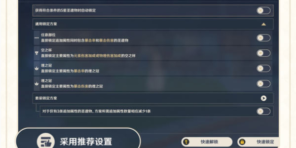 1、5.2版本起,旅行者可以使用推荐的锁定方案,开启后无需其他操作,系统会自动锁定符合要求的圣遗物。