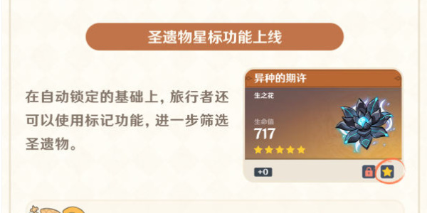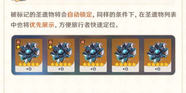 4、被标记的圣遗物将会自动锁定,同样的条件下,在圣遗物列表中也将优先展示,方便旅行者快速定位。