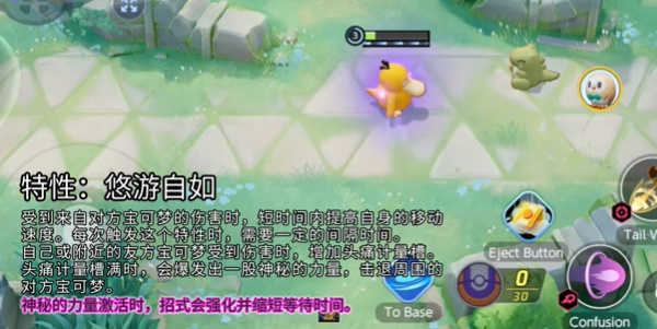 3、这个宝可梦的特性【悠游自如】,神秘的力量激活时,招式会强化并缩短CD时间,受到来自对方宝可梦的伤害时,短时间内提高自身的移动速度。