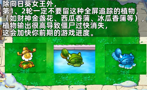 6、前期除向日葵女王外的全屏追踪植物都不推荐留,以免导致过高的输出加快僵尸出现频率,使得前期压力变大。