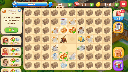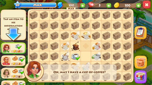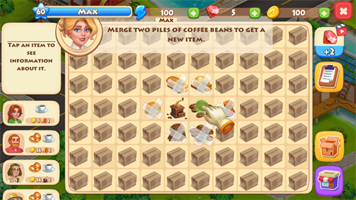 3、玩家可以来到小镇,根据客人的不同需求以拖动合成的方式制作相应食物与饮品;