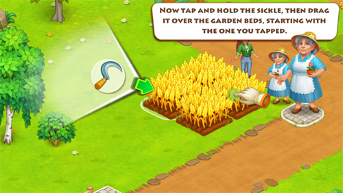 1、通过点击需要收割的农作物,会显示镰刀,按住镰刀拖动即可完成收割;