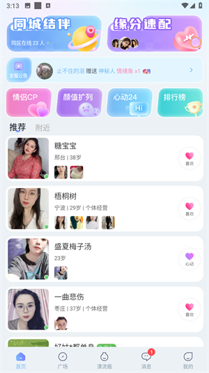 1、打开软件,进入首页,支持同城结伴,还能够缘分速配。