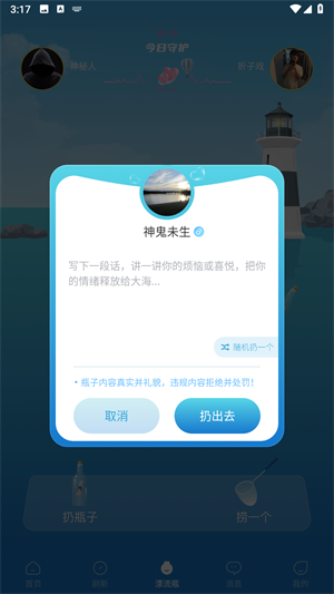 非常好用的交友漂流瓶软件,你可以将自己的心情和想法写在漂流瓶中,然后将其投入大海,其他用户捞到漂流瓶后,可以给用户回信或者与他们进行交流,这是一种充满神秘感和浪漫感的交友方式。