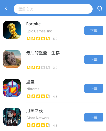 2、进入应用以后,在顶部搜索【堡垒之夜】或者Fortnite,即可找到游戏客户端。