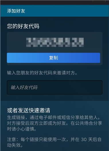 3、查看自己的好友代码,让好友复制粘贴,即可添加。