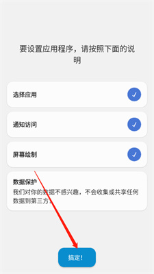 2、然后大家按照下面的说明来进行一一设定软件所需要的权限来!完事点击【搞定】!