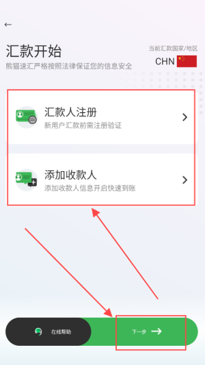 2、填写完汇款人注册、添加收款人两个信息之后,再点下一步就可以汇款了。