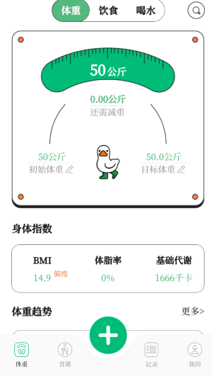2、每日晨起测量后,在主页点击"+"号记录最新体重,可同步添加体脂等附加指标。
