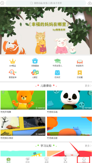 2、早教资源中心,包含儿歌、故事、认知游戏等丰富互动内容。