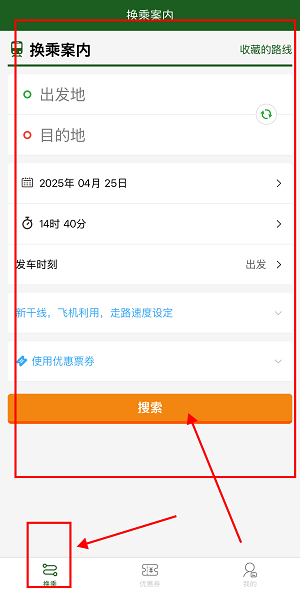 1、打开日本换乘案内app,在换乘页面中输入出发地和目的地,确认时间就可以点击“搜索”了。