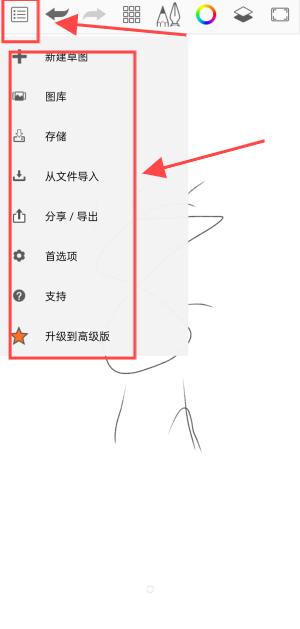 1、打开软件就是画板,左上角的按键可以重新建一个草图还可以导入、导出等。