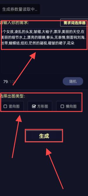 1、打开软件后,输入想要生成的图片要求,也可以点击需求选择器。