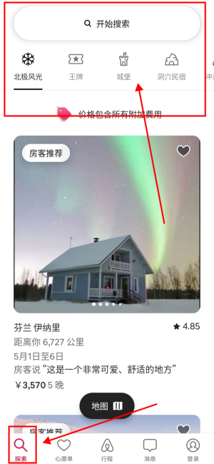 3、在探索页面中点击开始搜索就可以搜索想要的民宿。