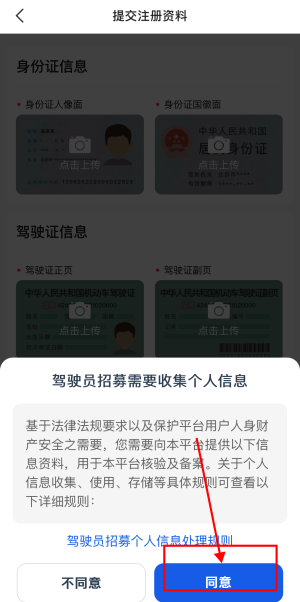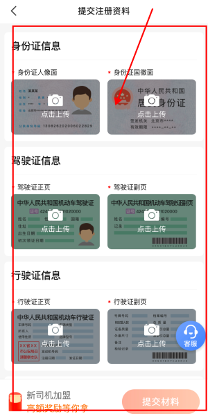 3、输入身份证、驾驶证等信息点击“提交材料”,审核通过就可以加入赚钱了。