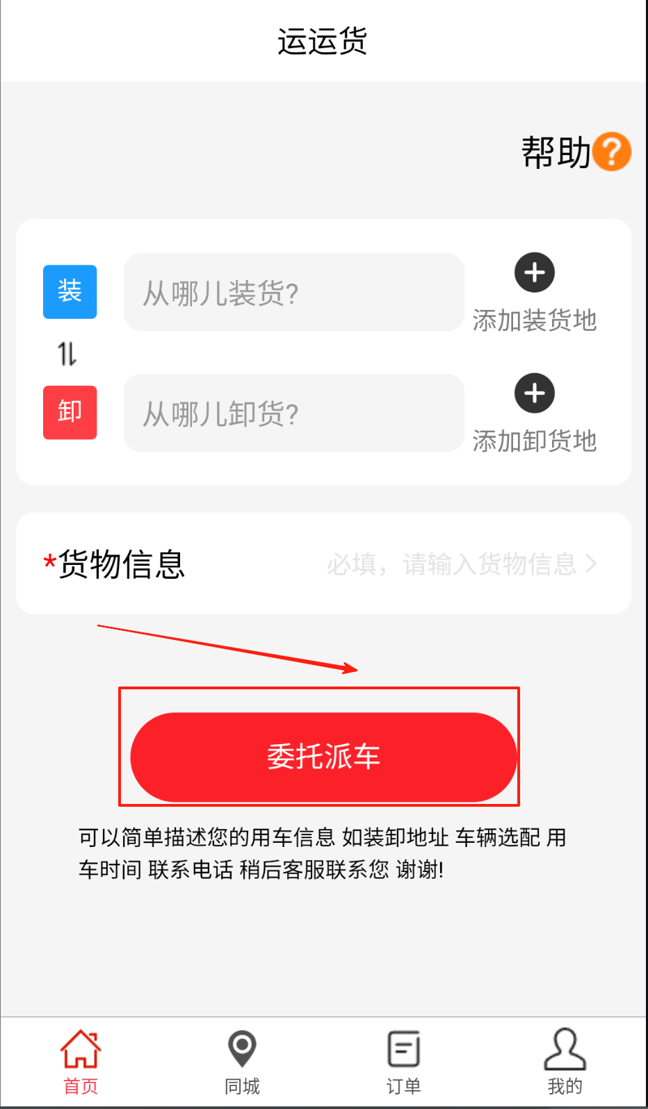2、货主在首页点击发货按钮填写货物详情与运费金额自动生成订单。