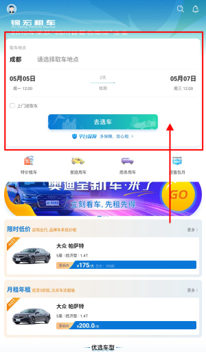 3、输入取车地点和日期点击“去选车”,就可以租车了。