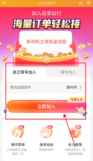 1、打开巡享出行app,选择加入方式点击“立即加入”。