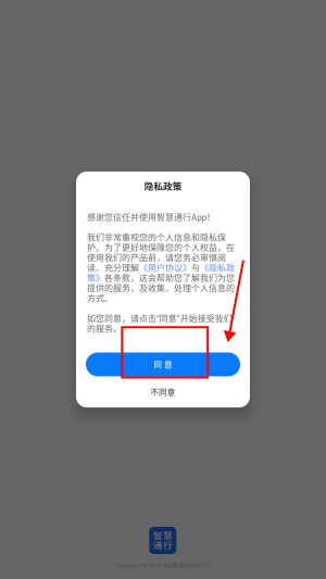 1、打开智慧通行app,点击“同意”。