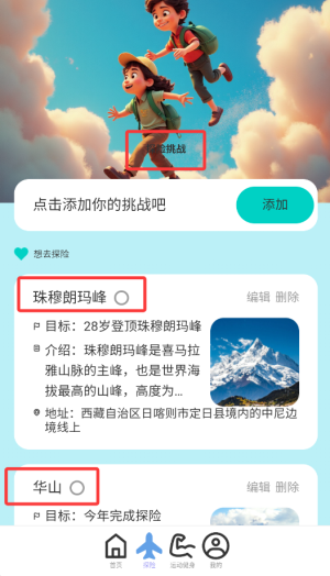 3、点击探险,可以添加需要的挑战。