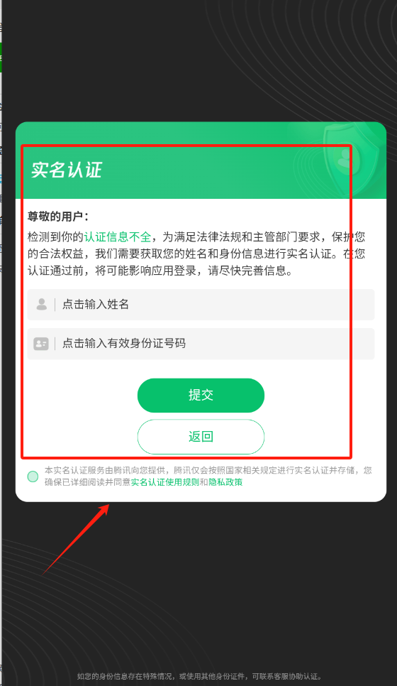 1、实名认证页面,顶部有实名认证标题。按要求填姓名和身份证号,点绿色提交完成认证,填错可点返回修改。
