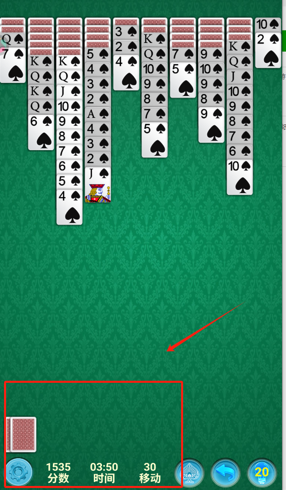 3、纸牌游戏界面中,绿色背景上排着很多黑桃牌。中间有张翻开的彩色牌,底部有牌堆。右下角显示分数和时间,右侧有四个功能按钮。