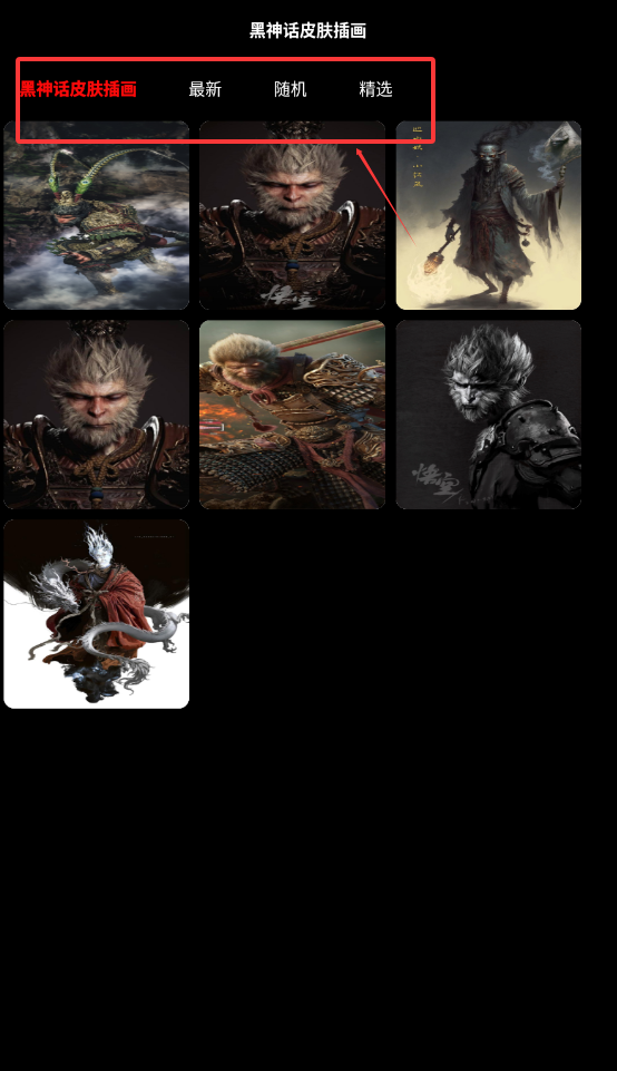 3、进入黑神话皮肤插画,可以选择最新,随机,精选,即可选项选择插画制作。